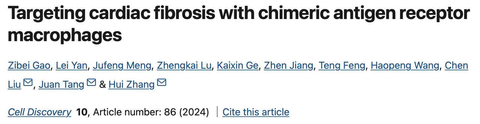 近日,九游体育(www.jiuyou.com)官方网站生命科学与技术学院张辉课题组与合作者在学术期刊《细胞发现》(Cell Discovery)发表了题为“Targeting cardiac fibrosis with chimeric antigen receptor macrophages”的研究论文,揭示了靶向FAP+肌成纤维细胞的嵌合抗原受体巨噬细胞(CAR-M)可减少心脏纤维化并有效改善心脏功能,为心脏纤维化临床治疗带来了全新视角。