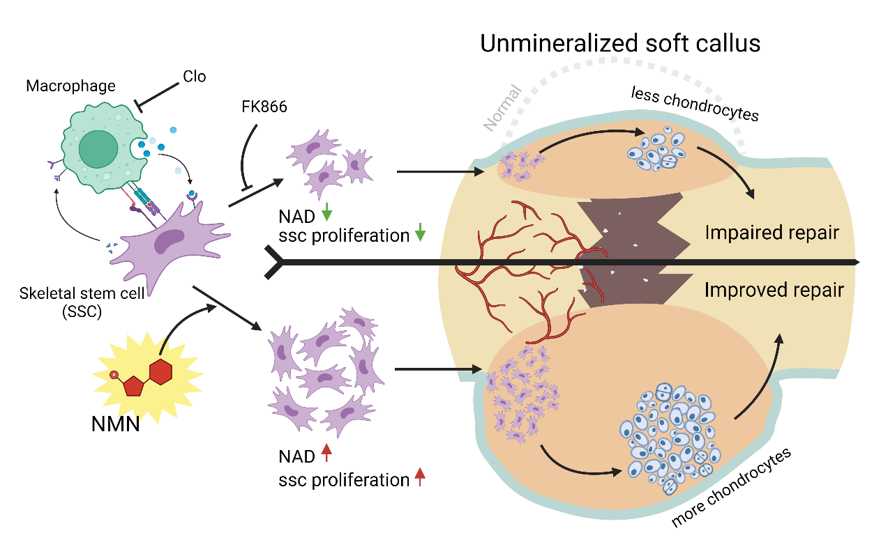 NMN是NAD(烟酰胺腺嘌呤二核苷酸)的重要生物合成前体和促进剂,通过外源性给药可以提升体内NAD水平,从而缓解与衰老相关的骨质流失及其引发的骨质疏松症。此外,NMN对维持骨稳态中的干细胞活性也发挥显著作用。然而,NMN是否能促进骨折断端骨骼干细胞的增殖功能并加速骨折愈合,目前仍不明确。