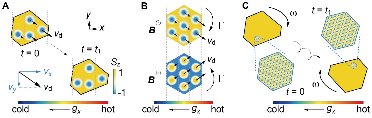 本工作聚焦于绝缘性手性磁体Cu2OSeO3中有限尺寸的磁斯格明子晶格板块。当施加一个线性温度梯度时,这些磁斯格明子板块不仅被推动,还通过一种手性晶格力矩的机制产生了连续的旋转运动。这种手性晶格力矩的引入,使得磁斯格明子晶格在微小温度梯度下呈现出旋进的特性,且旋转的方向可以通过调整磁场的方向来控制。其手性晶格矩的产生机制由图1所示,导致晶格同时发生转动和平移两种动力学模式。