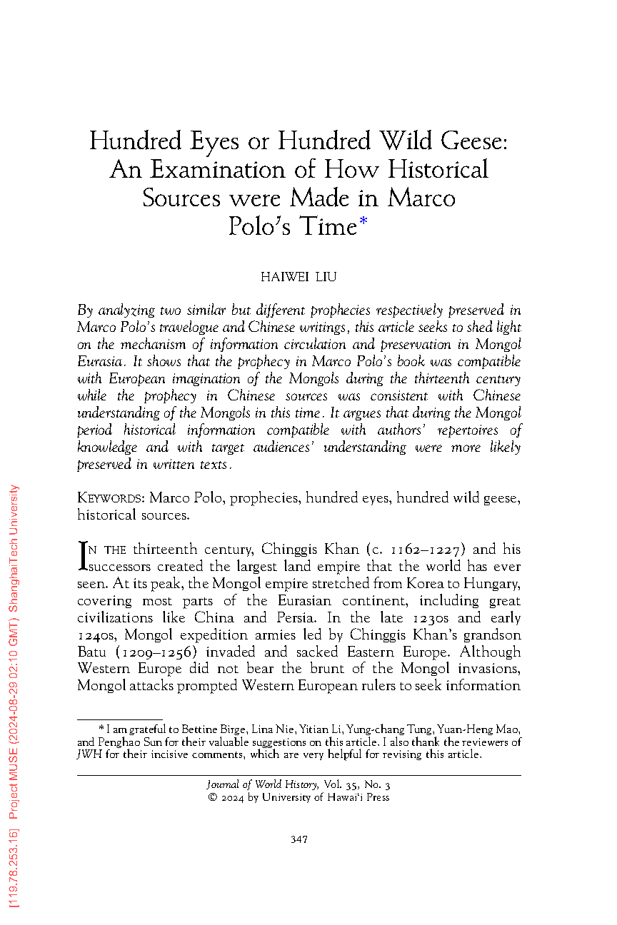 论文题目:Hundred Eyes or Hundred Wild Geese: An Examination of How Historical Sources were Made in Marco Polo's Time