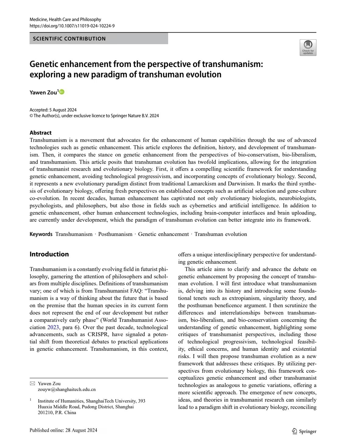 8月28日,助理教授邹亚文在欧洲医学和医疗保健哲学学会官方期刊《医疗保健和哲学》(Medicine, Health Care and Philosophy)发表研究论文,从超人类主义(Transhumanism)视角探讨了基因增强,并提出“Transhuman evolution”这一概念。超人类主义是一种倡导通过使用基因增强等技术来提高人类能力的思潮。论文梳理了超人类主义的定义、历史和发展,比较了生物保守主义、生物自由主义和超人类主义对于基因增强的不同观点。作者考察了现有超人类主义的局限性及受到的质疑,提出“Transhuman evolution(超人类进化,指进行中的人类向后人类持续进化)”概念。它将科技置于进化生物学框架,有助于超人类主义研究和进化生物学领域的相互借鉴和跨学科探索。在基因增强等新技术对达尔文主义和拉马克主义带来挑战的背景下,这一新的综合性框架能够适应技术的进步,引发对传统进化理念的新思考,丰富对于进化的认识和理解。