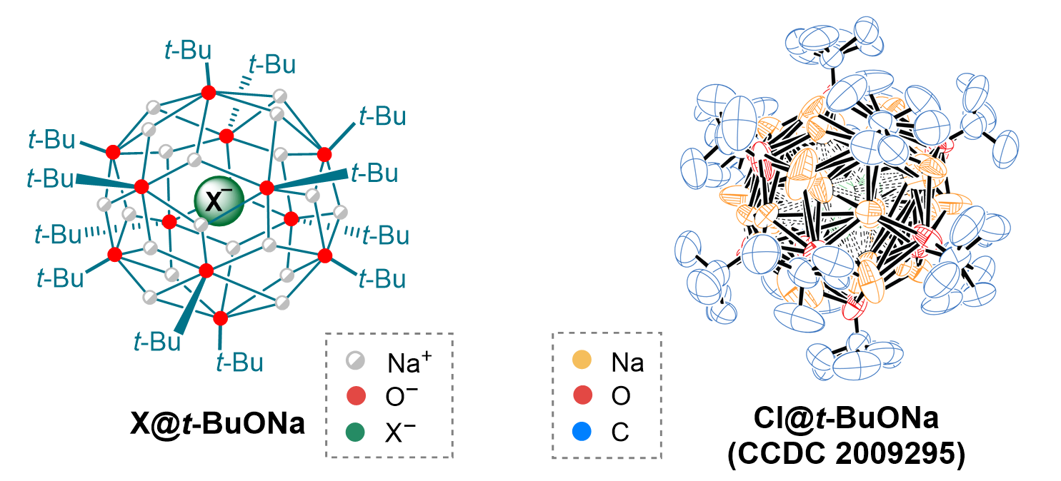 为解决醌类维生素的合成问题,李智课题组开始研究碱性催化条件下、氧化还原链式机理的可行性,这一极具探索性的任务交给了当时大二的2017级本科生张子宁同学。他不仅发现碱性条件可以解决该问题,还在实验过程中意外观察到了一类全新的含有卤素离子的叔丁醇钠团簇分子晶体(NaOR)12·NaX,也即“X@RONa”,并使用X射线晶体衍射技术确认了其微观结构:一个高度对称的笼状团簇,氯离子被烷基醇钠组成的壳层包裹在笼子中心。