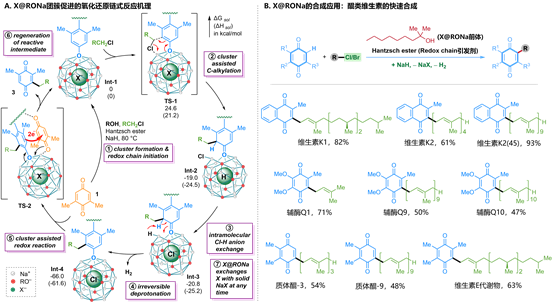 后续研究表明,X@RONa团簇正是催化作用的核心物质,其他形态的醇钠碱无法实现该反应。通过对团簇进行结构设计,维生素K、辅酶Q以及多种其他醌类天然产物都可实现一步法高效合成。进一步机理研究揭示了X@RONa的每个结构组成部分都在氧化还原链式反应中发挥了关键作用:其一,通过X@RONa的RO醇盐交换,将氢醌中间体的酚氧基嵌入X@RONa团簇从而抑制酚氧基的烷基化副反应,该副反应会严重影响主要反应的进行;其二,通过X@RONa与固体盐之间交换X离子的相转移作用,增加固体碱氢化钠的溶解性,加快反应进行;其三,通过X@RONa的Na离子的路易斯酸性,促进氢醌中间体与原料醌的氧化还原链转移。