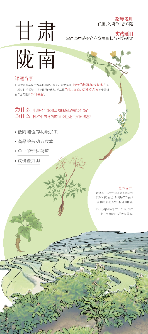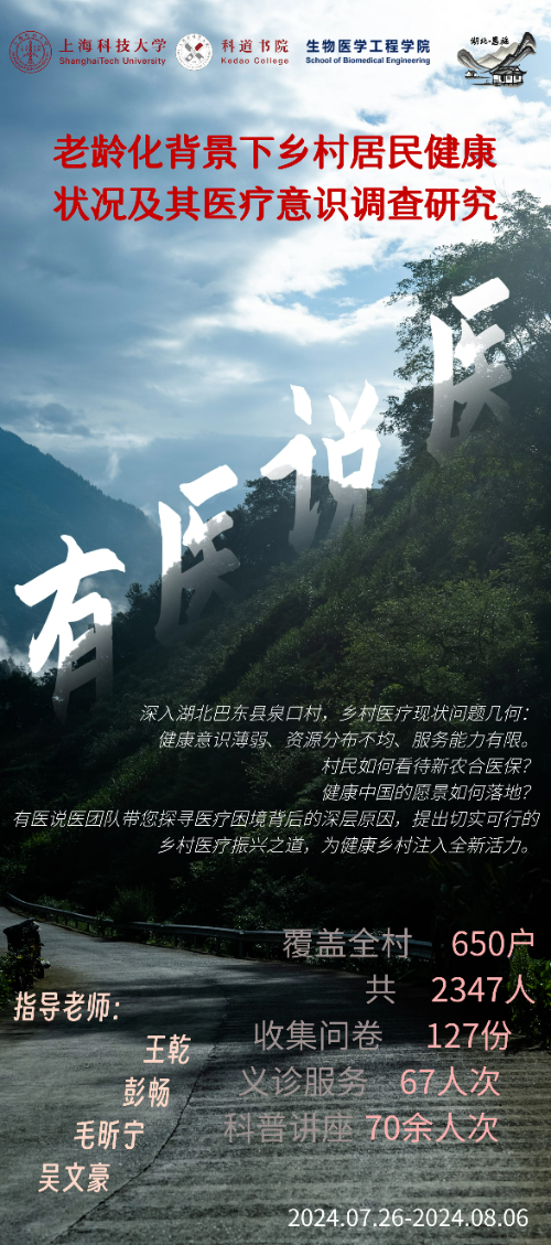 湖北恩施团队以泉口村为例,对老龄化背景下乡村居民健康状况及其医疗意识做了调查研究,并携手复旦大学附属中山医院共同开展义诊活动。陕西延安团队以“红色文化视觉下的延安文旅新潮:传承与创新的交响曲”为题,探讨了延安发展红色文旅的理想发展模式。云南建水一队深入分析了建水县学生的成长环境、心理健康、学科学习及生涯规划情况,对城乡融合教育的发展提出了可能建议。甘肃陇南团队对甘肃省宕昌县中药材产业的发展现状和存在问题进行调研,力图寻找中药材产业发展的瓶颈并提出优化措施。云南挖色团队深入探讨了白族文化及其非物质文化遗产的保护与传承问题,以及现代技术在保护与传承白族文化中的应用。贵州六盘水团队分析了猕猴桃、刺梨、茶叶等特色农业产业对农业现代化发展的影响,以及旅游业产业化对地方经济的推动作用。