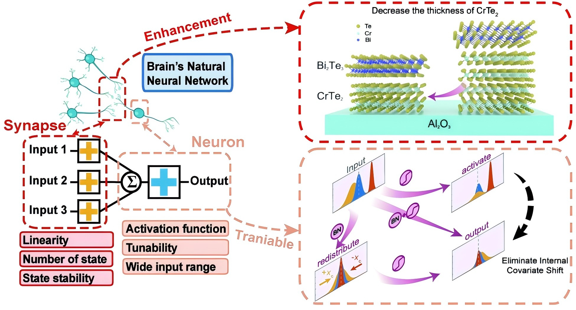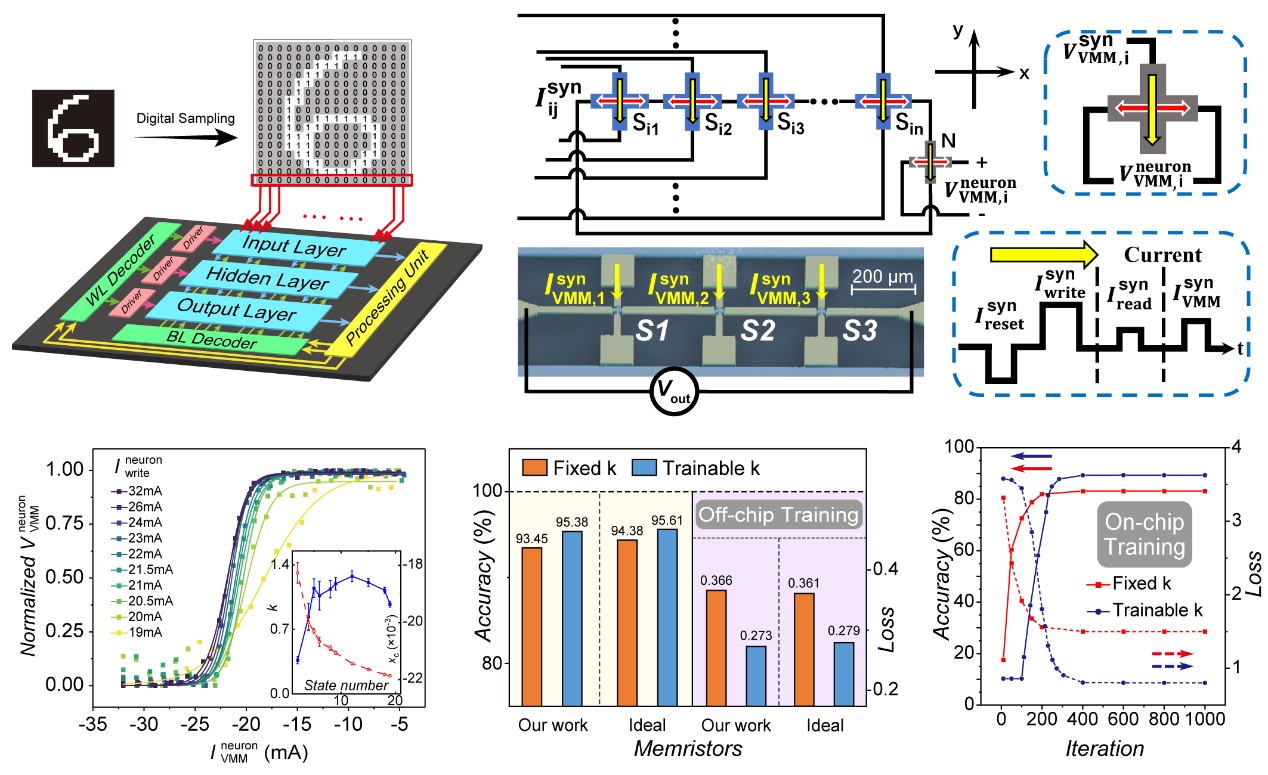 在前期工作中,研究人员基于Bi2Te3/CrTe2薄膜实现了低功耗的自旋轨道矩(SOT)驱动的磁化翻转。在此基础上,团队通过自旋轨道矩对磁畴的精确调控,实现了霍尔电阻的多阻态现象,展现出高线性度和高对称性的长时程增强/抑制(LTP/LTD)过程,实现了类脑突触器件的功能。此外,SOT 磁化翻转过程中,霍尔电阻与驱动电流天然符合 Sigmoid 函数的特性,可用于实现神经网络中的Sigmoid激活函数。基于这一特性,研究人员提出了一种串联连接的电压感知人工神经网络(ANN)架构。该架构不仅增强了矩阵-向量乘积信号的强度,还实现了低至 0.61% 的读出误差,简化了外围电路设计。更重要的是,研究发现,不同电阻态下的 Sigmoid 函数模块具备可调节系数,赋予其可训练的激活函数特性。这一特性允许集成 ANN 中的批量归一化算法,从而有效简化系统架构并显著提升网络性能。这一研究成果为基于拓扑绝缘体材料的神经网络应用提供了一种集成化、软硬件协同优化的新型解决方案。