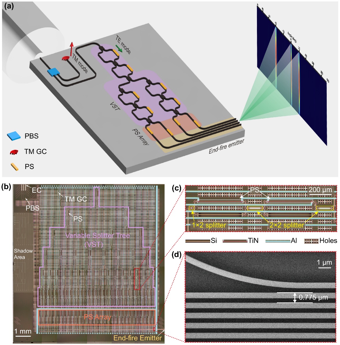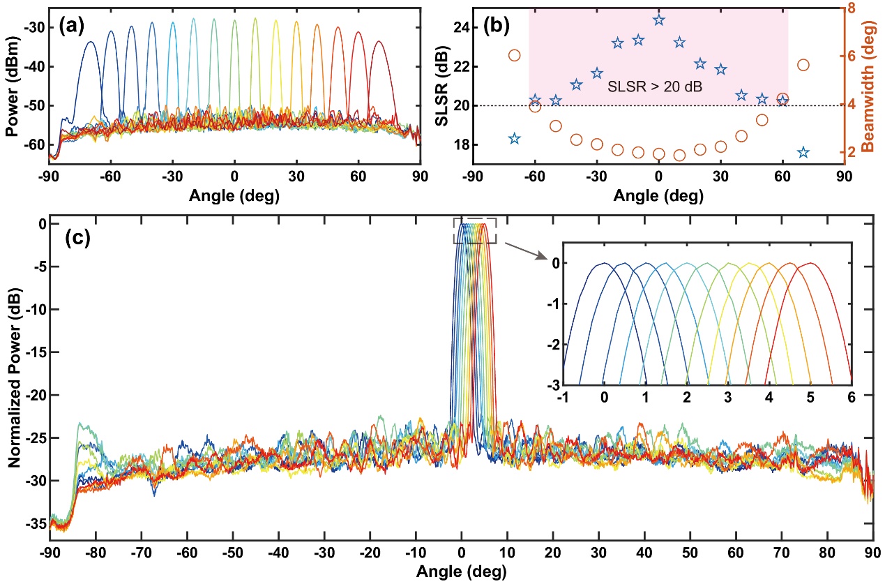 随着激光雷达(LiDAR)和空间光通信等技术的快速发展,小型固态光束控制装置引起了广泛关注。这类装置需要能够在大视角范围内灵活调整方向的高质量单波束,具备较小的发散角和更高的旁瓣抑制比,以实现更大的覆盖范围、更高的分辨率和更低的功耗。在这种需求的驱动下,硅基光学相控阵逐渐成为固态光束控制研究的热点。目前,大部分硅基光学相控阵的研究重点集中在减小光束发散角,以实现更远的波束扫描。然而,相较于波束扫描,波束成形的潜力常被忽视。波束成形不仅可以提升光束的质量,还能支持更复杂的应用场景,如目标追踪和多点通信等。这些功能在微波领域已得到广泛应用,但在光学领域的研究仍鲜有报道。