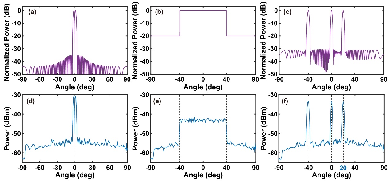 刘晓平课题组提出的这一新架构采用由两层马赫-曾德尔干涉结构组成的二分树结构,不仅能够实现任意的光强分布,还具备较强的抗加工误差能力(如图1)。为了提高远场信噪比,该架构引入了多种抑制杂散光的策略,包括空气孔和偏振分束器等优化设计。其发射天线由64根波导阵列组成,波导间距为半波长(775 nm),激光波长为1550 nm,通过波导端面直接向外辐射。研究表明,该硅基光学相控阵在120°视场范围内进行波束扫描时,旁瓣抑制比依然能够保持在20 dB以上(图2)。此外,为验证其任意波束成形能力,实验选取了Bayliss差波、脉冲形方波和非对称三光束三种复杂波束作为测试对象,并获得了与目标波束高度吻合的实验结果(图3)。值得一提的是,该架构具有良好的拓展性,且适用于其他光子集成平台,为实现多功能光束控制提供了新的可能性。