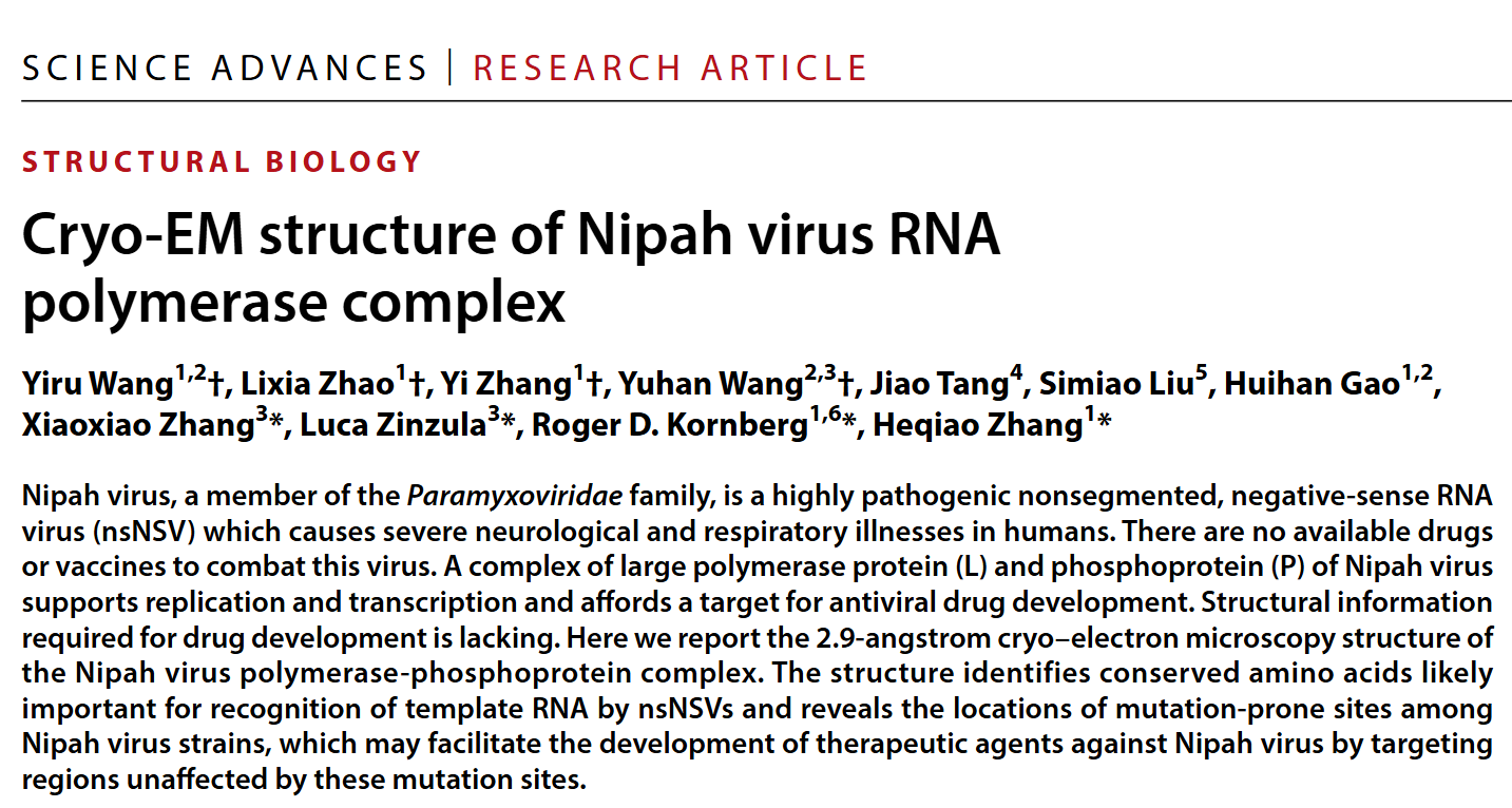 12月11日,九游体育(www.jiuyou.com)官方网站免疫化学研究所Roger Kornberg/张贺桥研究团队(结构生物化学课题组)与iHuman 研究所合作者在国际学术期刊Science Advances上在线发表了题为“Cryo-EM structure of Nipah virus RNA polymerase complex”的研究论文,报道了尼帕病毒(Nipah virus)RNA依赖RNA聚合酶复合物的结构特征。