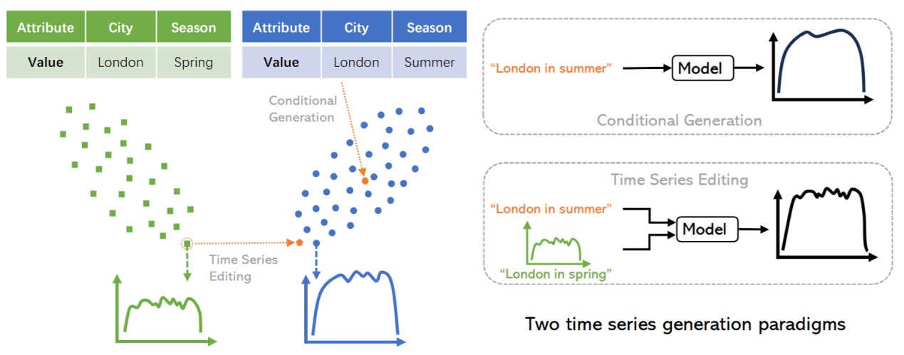 时间序列生成是时间序列分析的一项基础且重要的任务,其目标主要用来解决现实数据的稀疏性、隐私敏感性等问题。本研究首次提出了一个全新的时间序列生成任务范式——时间序列编辑。该方法能够在给定样本的基础上,针对特定需求灵活修改属性(如心率数据中的异常值、气象数据中的特定波动),这为生成更贴合实际需求的数据提供了可能。本研究还创新推动了时间序列生成模型从“生成数据”走向“编辑数据”的精细化操作。这不仅拓展了生成模型的应用场景,也为更高效的时间序列生成方法提供了思路。