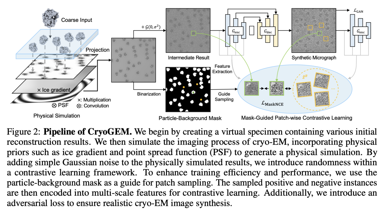 单颗粒冷冻电子显微镜(cryo-EM)在解析蛋白质的近原子分辨率三维结构方面至关重要。由于缺乏高质量的标注数据集进行训练,目前的AI冷冻电镜模型性能仍然受到限制。本研究提出了一种基于物理信息的生成冷冻电子显微镜(CryoGEM)模型,首次将基于物理的cryo-EM模拟与生成的无配对噪声转换相结合,从而生成具有逼真噪声的物理正确的合成cryo-EM数据集。大量实验表明,CryoGEM能够生成真实的cryo-EM图像。生成的数据集可以作为冷冻电镜基础大模型、粒子挑选和姿势估计模型的训练数据,最终提高重建分辨率。