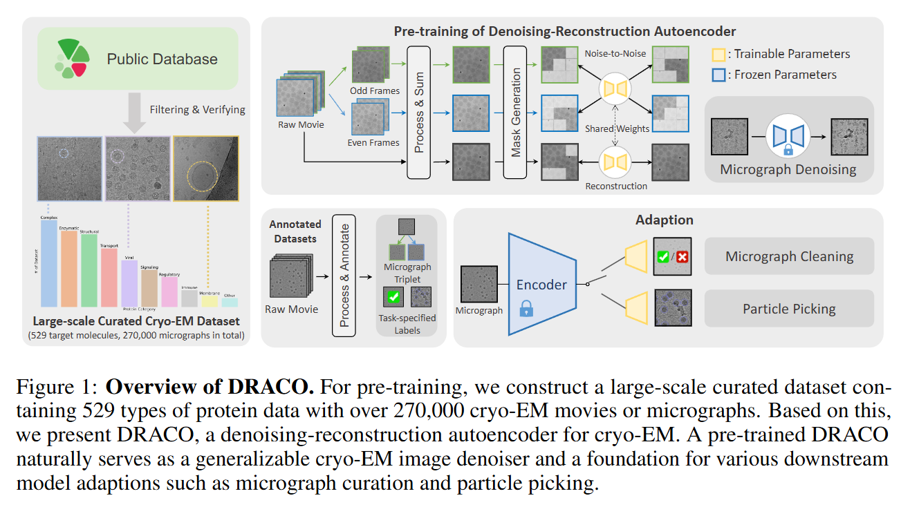 自监督预训练方法往往忽视了冷冻电镜(cryo-EM)图像中由高水平噪声引起的严重损坏。研究人员提出了DRACO,一种用于cryo-EM的去噪重建自编码器,灵感来自Noise2Noise(N2N)方法,应用了去噪-重建混合训练方案。对于DRACO的预训练,数据集的质量至关重要,研究人员从一个未经筛选的公共数据库中构建了一个高质量、多样化的数据集,包含超过27万个序列或显微图像。预训练后,DRACO自然作为一个通用的cryo-EM图像去噪器,并且成为各种cryo-EM下游任务的基础模型。与最先进的基准模型相比,DRACO在去噪、显微图像筛选和蛋白质颗粒挑选任务中表现出最佳性能。
