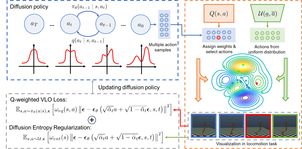实践证明,利用扩散策略可以显著提高强化学习算法在连续控制任务中的性能,克服单模态策略(如高斯策略)的局限性,以此来为智能体提供更强的探索能力。由于缺乏样本标签,扩散模型的训练目标无法用于在线强化学习中直接进行优化。为了克服这个问题,本研究提出了一种基于扩散模型的在线强化学习算法:Q加权变分策略优化 (QVPO)。QVPO算法充分利用了扩散策略的探索能力和多模态性,防止强化学习策略收敛到次优解。MuJoCo仿真环境的连续控制任务基准上的全面测试表明,QVPO算法在累积奖励和样本效率方面都优于之前的其他算法。