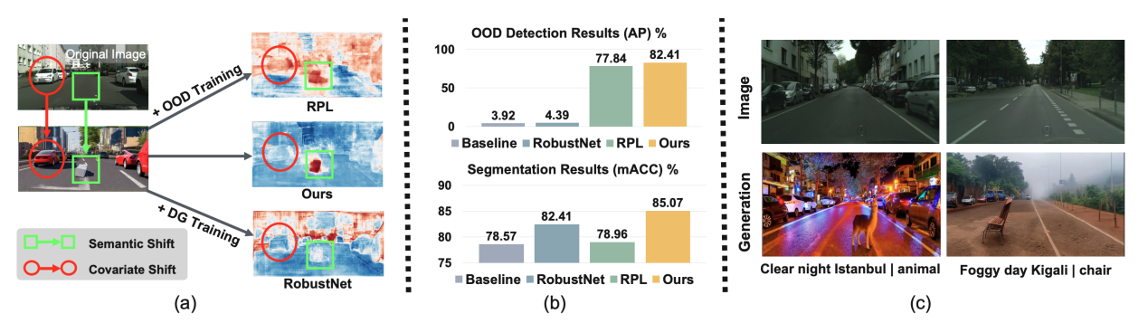 开放世界场景往往同时存在未知物体和未知领域,一个理想的分割模型需要具备检测未知物体(Out-of-Distribution Detection, OOD)并泛化到未知领域(Domain Generalization, DG)的能力。针对这一挑战,研究人员设计了一种新颖的生成式数据增强方法,用以产生同时包含新物体和新领域的图片。同时提出了一种新的训练策略,充分利用这些包含多种分布变化的生成图片。在具有语义和领域变化的所有基准测试中,该方法实现了未知物体检测和领域泛化任务的最先进性能。