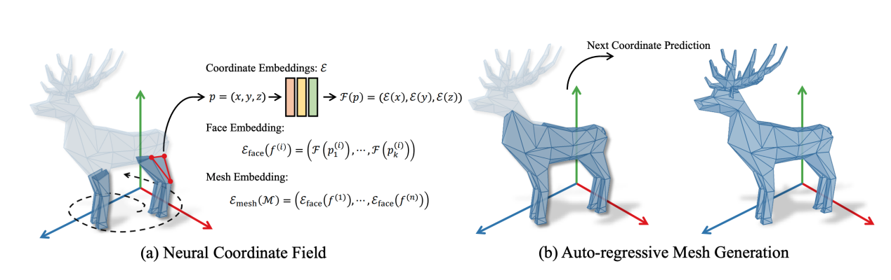 3D数据的多边形网格表示因其灵活性、快速渲染速度和存储效率,在各类应用中被广泛采用。然而,由于其非结构化的图表示,直接生成高保真度的3D网格具有挑战性。本研究提出了一种神经坐标场(NeurCF),结合显式坐标表示和隐式神经嵌入,为大规模序列化网格建模提供了一种简单而有效的表示方法。基于此,研究人员开发了MeshXL,这是一系列生成式预训练自回归模型,能够生成高质量的3D网格,并可作为各种下游应用的基础模型。