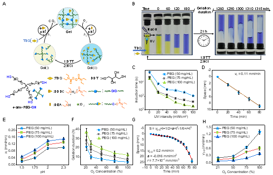 研究发现,初次的溶胶-凝胶转变前沿除了可以通过加碱液来引发,还能通过紫外光照启动,其引发时间可由光强加以调控。在自催化反应扩散系统中,化学前沿以恒定速度移动,受反应动力学与扩散特性控制。第一次转变前沿的速度可以通过调整初始pH值及单体浓度来调节。对于第二次前沿,由于反应动力学较慢且需要氧气参与,其速度会形成独特的加速转变。这一转变的速度及凝胶化时间则可通过改变单体浓度和氧气浓度来调节。