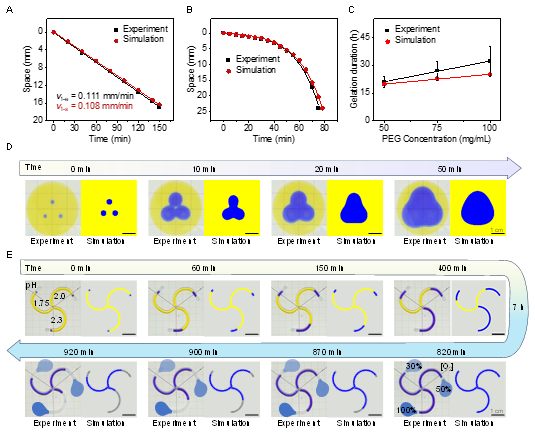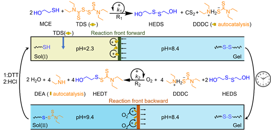 本研究中,化学反应网络通过自催化反应的前沿传播来控制二硫化物的形成和降解。在R1反应中,二乙基二硫代氨基甲酸二乙铵(DDDC)的扩散驱动了正向传播,形成的pH前沿促进了溶液-凝胶的转变。正向反应完成后,经过一段凝胶期,凝胶-空气界面触发了较慢的R2反应,导致二硫键断裂,凝胶再次转换为液相。完成两次自催化前沿后,通过加入还原剂二硫代苏糖醇(DTT)还原生成初始单体2-巯基乙醇(MCE),再调节体系至酸性后加入二硫化四乙基秋兰姆(TDS),可重新启动新的可逆转变前沿循环。