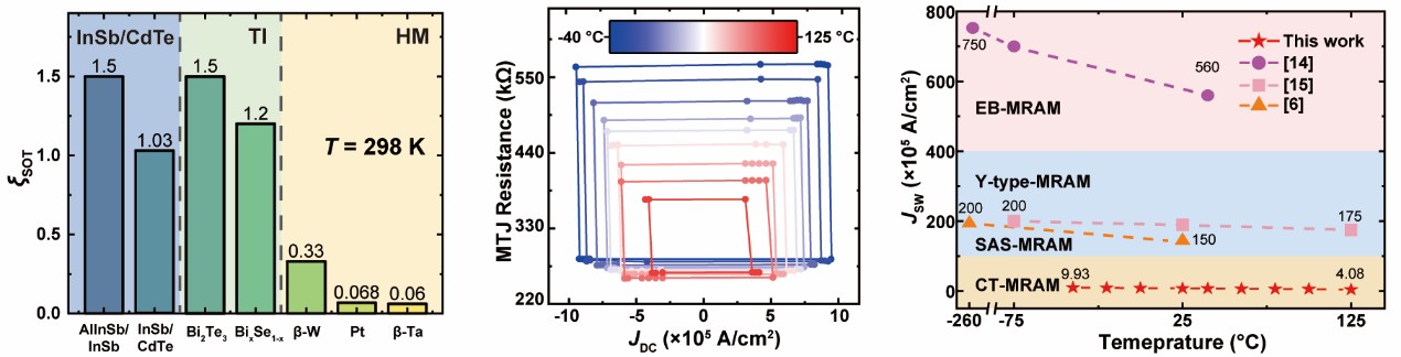 图2 | 无辅助磁场CT-MRAM器件实现40℃至+125℃温度区间的高效工作