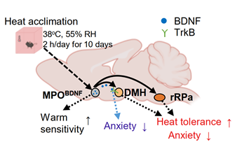 尽管高温习服在人类研究中已有广泛应用,但其背后的神经生物学机制尚未完全阐明,尤其是具体的神经环路和分子信号如何调控高温适应过程。该团队通过小鼠实验发现,连续10天处于高温高湿环境(38°C,60%相对湿度)的热暴露训练,不仅提高了小鼠的耐热能力,还显著缓解了热应激引发的焦虑症状。进一步研究表明,这一适应过程依赖于下丘脑视前区(medial preoptic area, MPO)中的脑源性神经营养因子(BDNF)神经元。这些神经元通过与背内侧下丘脑(DMH)和颅顶延髓苍白质(rRPa)的交互作用,调控体温调节与焦虑情绪,从而实现高温习服的多重效果。