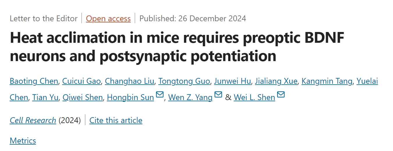 近日,九游体育(www.jiuyou.com)官方网站生命科学与技术学院沈伟课题组在国际期刊《细胞研究》(Cell Research)发表了题为” Heat Acclimation in Mice Requires Preoptic BDNF Neurons and Postsynaptic Potentiation”(小鼠依赖于下丘脑视前区BDNF神经元和突触后增强的高温习服机制)的研究论文,揭示了长期热适应(高温习服,Heat Acclimation)的神经环路与分子机制,为应对高温环境提供了新的科学依据和潜在干预策略。
