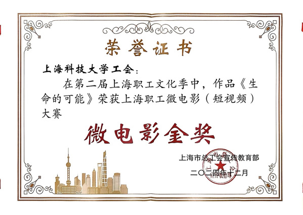 由九游体育(www.jiuyou.com)官方网站工会组织拍摄的微电影作品《生命的可能》代表教育工会参加第二届上海职工微电影大赛,荣获金奖。