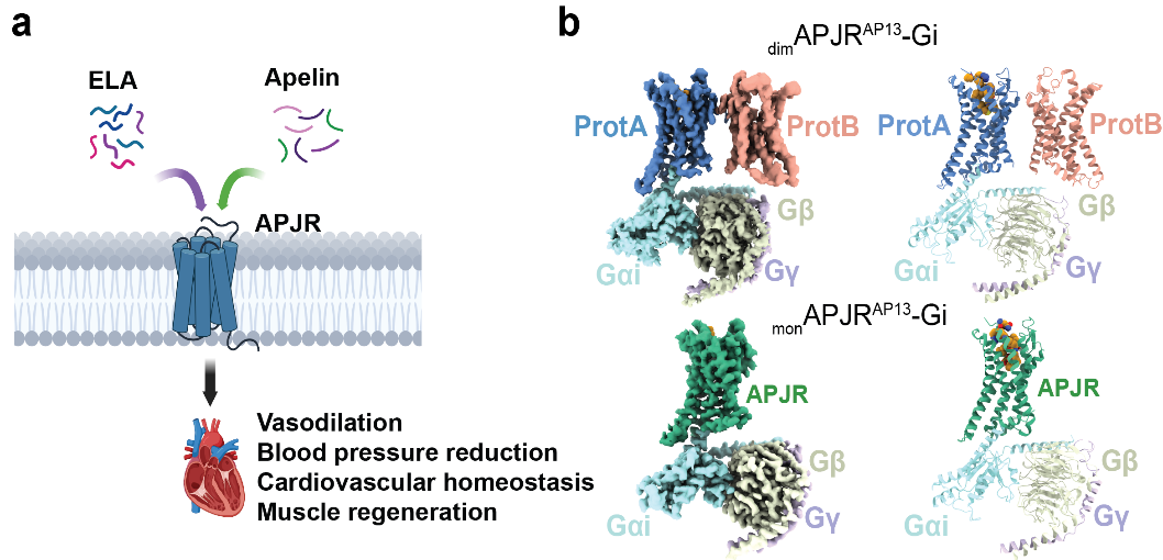 图1:APJR二聚体-Gi和APJR单体-Gi复合物结合apelin-13的冷冻电镜结构。(a)两种内源性多肽配体对APJR产生的药理学效应模型。(b)Apelin13-APJR二聚体-Gi复合物和Apelin13-APJR单体-Gi复合物的冷冻电镜密度图及三维结构模型。