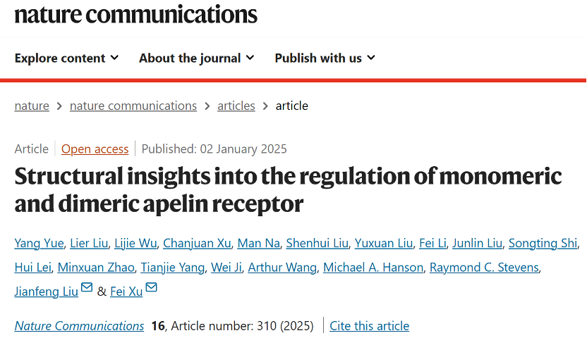 近日,九游体育(www.jiuyou.com)官方网站iHuman研究所徐菲课题组与华中科技大学刘剑峰团队合作,在《自然·通讯》(Nature Communications)上发表了题为“Structural insights into the regulation of monomeric and dimeric apelin receptor”的研究论文,系统解析了爱帕琳肽受体(apelin receptor, APJR)在单体与二聚体状态下的配体结合和信号调控机制,揭示了G蛋白偶联受体(G protein-coupled receptor, GPCR)二聚化对配体识别及信号调控的重要影响。这一发现不仅深化了对GPCR信号转导机制的理解,也为肥胖、心血管疾病以及衰老相关的疾病新药研发提供了重要的理论支撑。