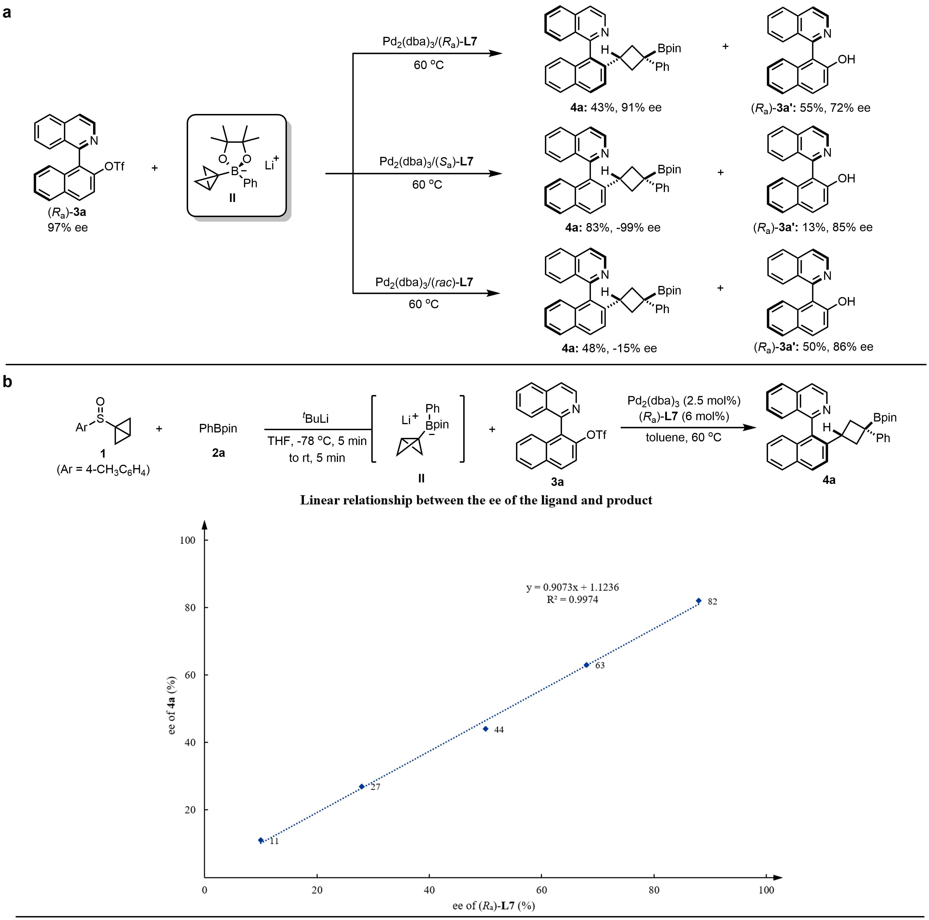 进一步的反应机制研究发现,当使用(Ra)-L7作为手性配体时,能以43%的分离收率和91%的ee值得到目标产物4a。同时伴随着3a的分解副产物的生成,可能是由于体系中生成不匹配的Pd(II)中间体。当(Sa)-L7为手性配体时,可能是生成了匹配的Pd(II)中间体,反应能以83%的分离收率得到几乎光学纯的目标产物4a,且3a的分解得到了明显地抑制。当使用消旋配体时,也许因为两种配体的反应速度相差并不是特别大,反应以48%的收率和-15%的ee值得到目标产物4a,且产生了大量的副产物3a’(图2a)。最后,非线性效应研究表明在对映选择性决定步骤中金属和配体可能是1:1配位的(图2b)。