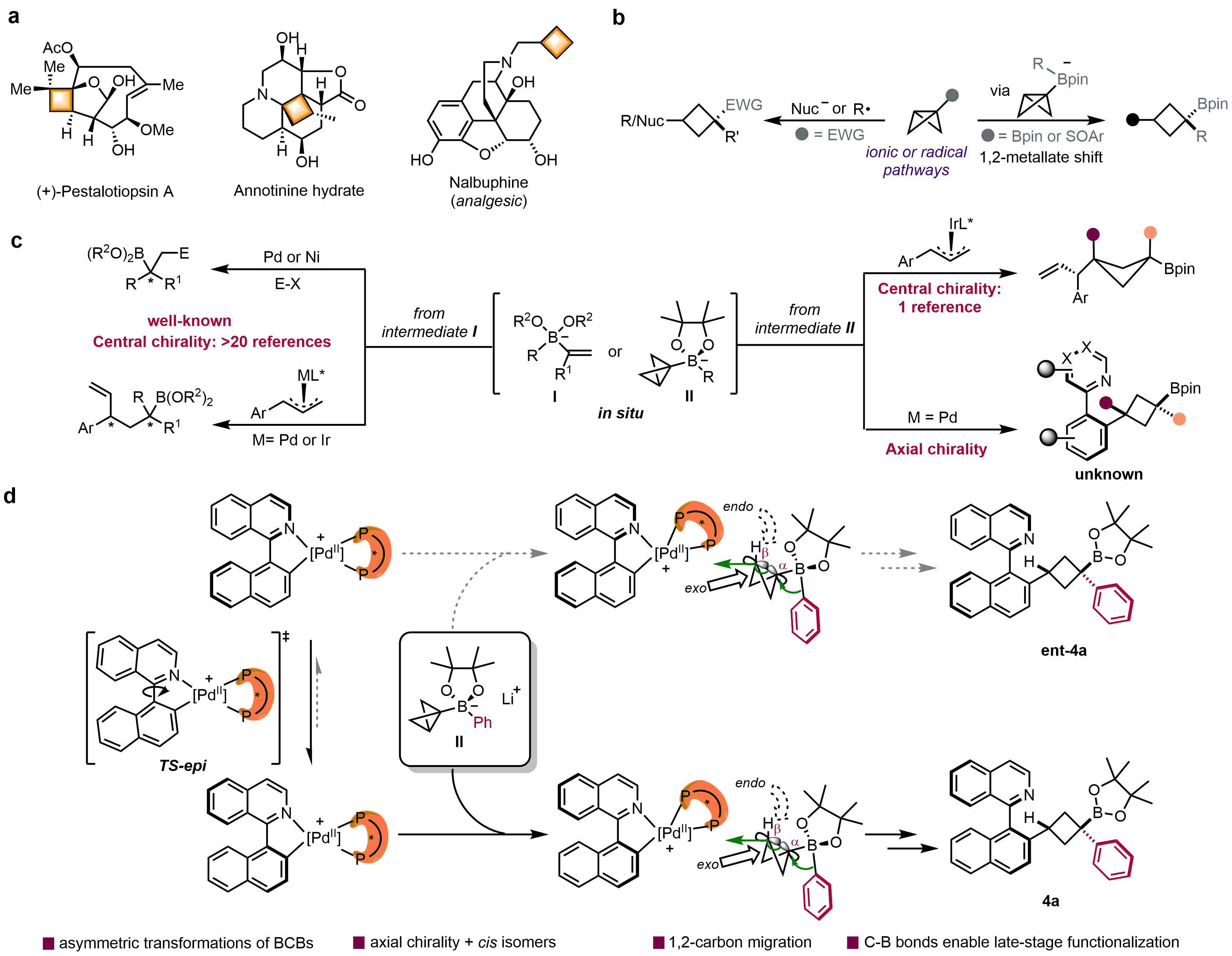 环丁烷骨架是有机化学中重要的单元,广泛存在于天然产物和生物活性分子中(图1a)。双环[1.1.0]丁烷(BCBs)及其衍生物由于桥连的C−C σ键具有高的环张力特性,近年来引起学术界的关注。该类化合物主要通过两种途径合成环丁烷骨架,其中之一就是BCB衍生的硼酸酯复合物通过1,2-金属酸盐重排反应,实现自由基或离子途径的环张力释放反应以制备多取代环丁烷硼酸酯(图1b)。可能是因为BCB衍生物的高反应活性使得反应的选择性调控极具挑战性(图1c),故其不对称调控一直进展缓慢。如果能够利用环张力释放策略,通过手性催化剂的精准调控,实现BCB硼酸酯复合物迁移反应的不对称控制,将显著拓展该类化合物在手性化学中的应用空间。