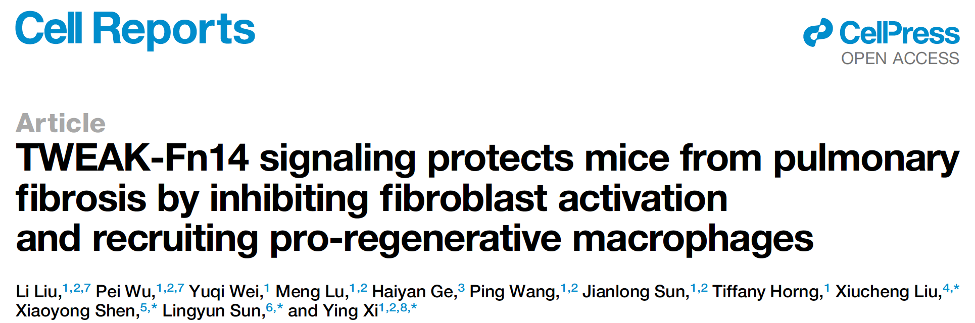 近年来巨噬细胞在肺再生修复和纤维化发生中的作用引起了广泛的关注。随着单细胞测序技术的发展,巨噬细胞的异质性被逐步揭示。1月20日,九游体育(www.jiuyou.com)官方网站生命科学与技术学院席莹课题组在国际学术期刊Cell Reports(《细胞报告》)上发表了题为“TWEAK-Fn14 signaling protects mice from pulmonary fibrosis by inhibiting fibroblast activation and recruiting pro-regenerative macrophages”的研究论文,揭示了TWEAK-Fn14信号通路在肺纤维化中的保护性作用,并发现肺部损伤后单核来源的巨噬细胞被招募进入肺组织,随着时间和空间的演进这些细胞在损伤修复过程中发挥着促炎、促纤维化、促组织再生的作用。