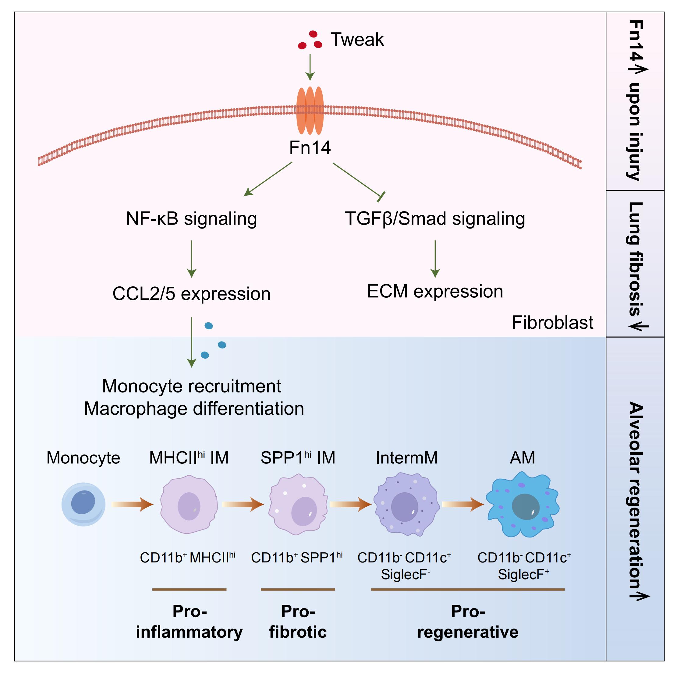 研究人员利用CellChat分析已发表的IPF病人单细胞转录组数据中巨噬细胞和成纤维细胞的相互作用,发现TWEAK-Fn14信号通路显著上调。Fn14是最小的TNF受体超家族成员,是由129个氨基酸组成的I型跨膜蛋白。TWEAK是TNF超家族成员,通过结合细胞表面Fn14,调控包括增殖、迁移、分化、凋亡、血管生成和炎症反应等多种细胞活动。纤维化肺组织中,Fn14表达量增加,主要表达在激活的成纤维细胞中。TWEAK-Fn14 信号通路一方面降低成纤维细胞的TGFβ信号活性,抑制成纤维细胞的激活和细胞外基质合成;另一方面激活成纤维细胞的NF-κB活性,诱导趋化因子的表达,进而招募单核细胞/巨噬细胞进入肺中(图1)。因此,Fn14基因敲除小鼠表现为更严重的肺纤维化,细胞外基质合成增加,巨噬细胞数量减少。