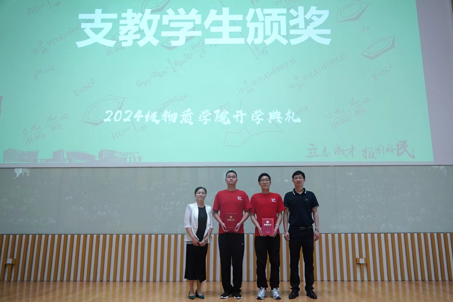 在2024年物质学院开学典礼上,涂江升和赵梓睿受到表彰