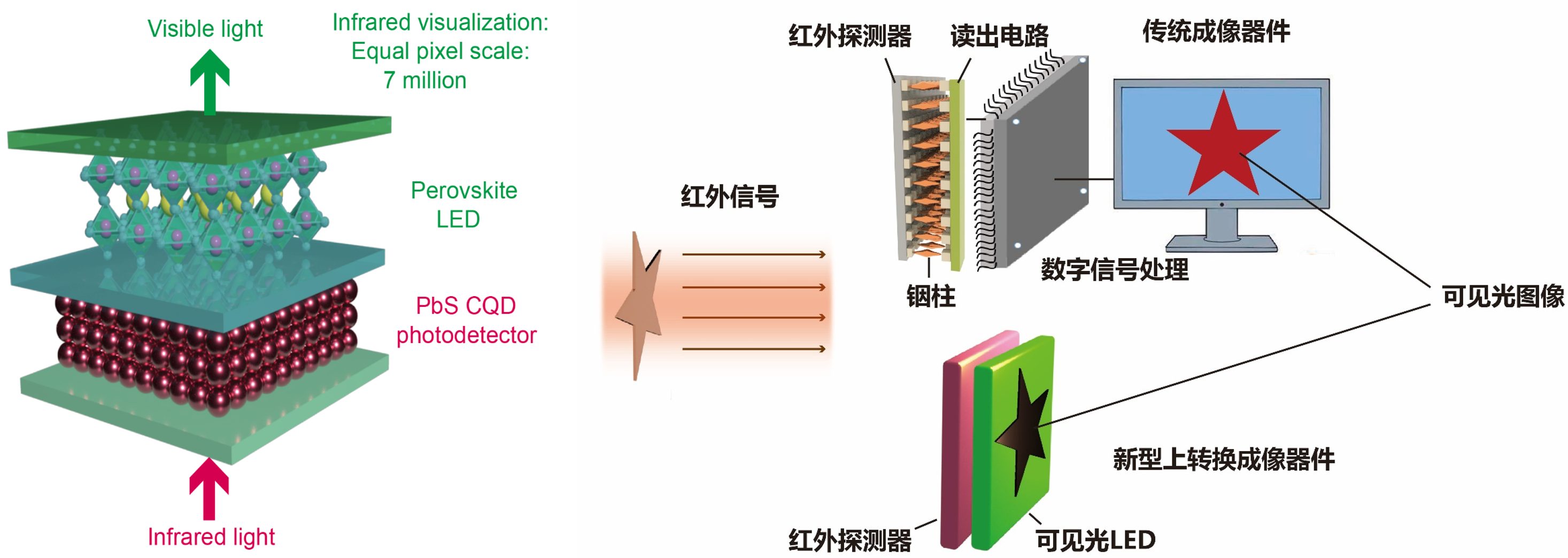 红外可视化技术在安全监控、医疗诊断、军事作战和工业检测等众多领域被广泛应用。传统的红外成像技术通常需要集成铟镓砷等探测器阵列与读出集成电路,实现图像显示还需要复杂的图像处理流程。整个过程中需要严格的倒装焊接,这不仅限制了像素尺寸和规模,还导致了高昂的成本。