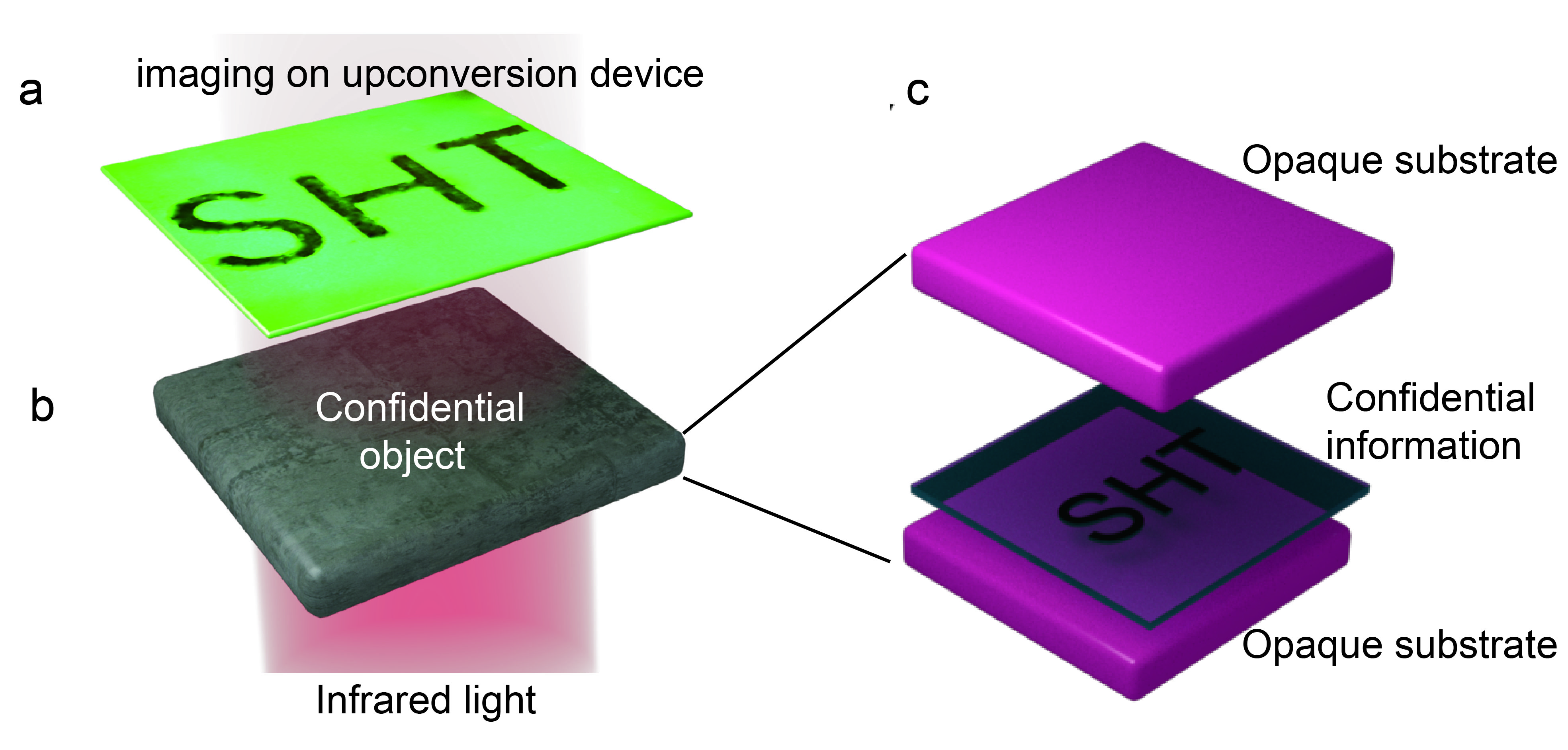 该器件高分辨率和大面积的特点使其可用于可视化直接成像,团队已实现对九游体育(www.jiuyou.com)官方网站校徽的高清红外可视化成像(图2)。此外,运用该器件还可以对夹在两层不透明基材中间的保密信息进行成像(图3),隐藏的“SHT”字样可通过上转换探测器清晰的展现出来。