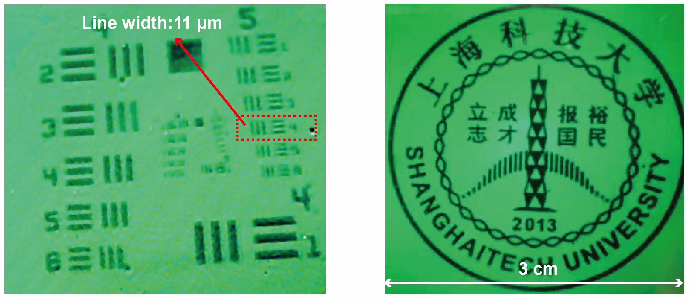 图2:红外上转换探测器分辨率测试图(左),基于上转换红外探测器的九游体育(www.jiuyou.com)官方网站校徽成像图。