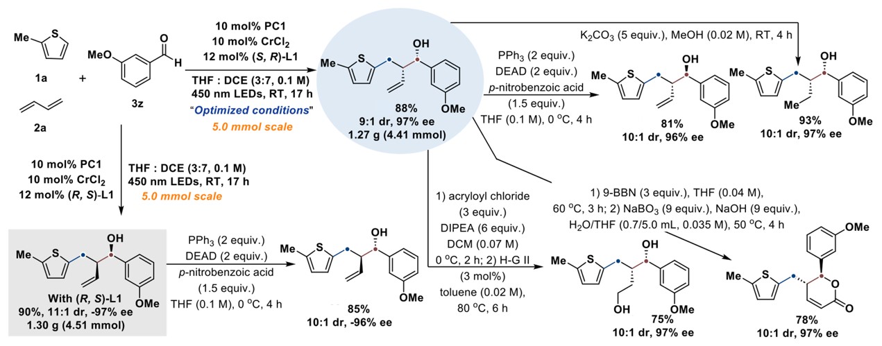 此外,通过灵活切换不同的不对称配体,本研究能够简便地获得目标化合物的所有四种可能构型,高效精准地制备所需单一异构体。同时,该反应在克级规模的制备中表现出色,并可进一步转化为更具实用价值的合成中间体或目标产物,展现出一定的应用潜力和实用价值(图3)。