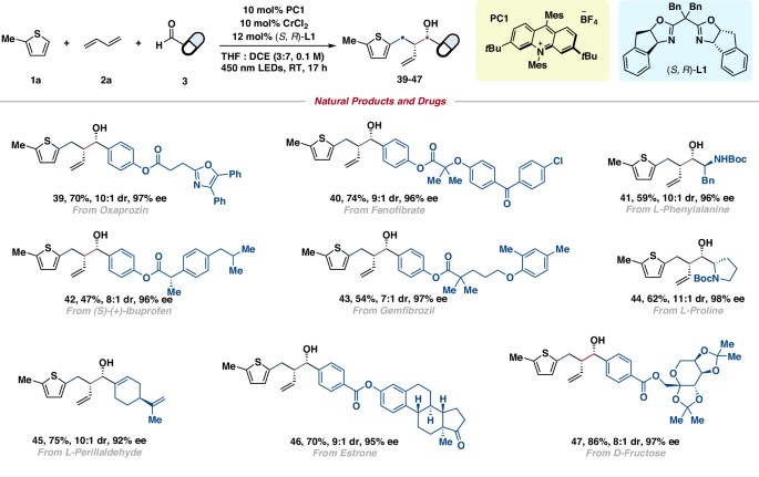 本成果具有优异的底物普适性和反应效率,尤其在多种天然产物和药物分子的后期功能化修饰中展现出广泛的应用潜力。新开发的不对称自由基极性交叉转化方法能够高效构建两个手性中心,并具有良好的底物耐受性,适用于各类药物衍生的醛类化合物、(杂)芳族化合物以及1,3-二烯衍生物(图2)。值得一提的是,该方法通过引入具有抗菌潜力的噻吩片段,为药物分子的后期修饰提供了一种高效便捷的途径。这一创新策略不仅显著拓展了药物分子的多样性及其潜在的药理活性,更为新药研发提供了有力工具,具有重要的应用价值和开发前景。