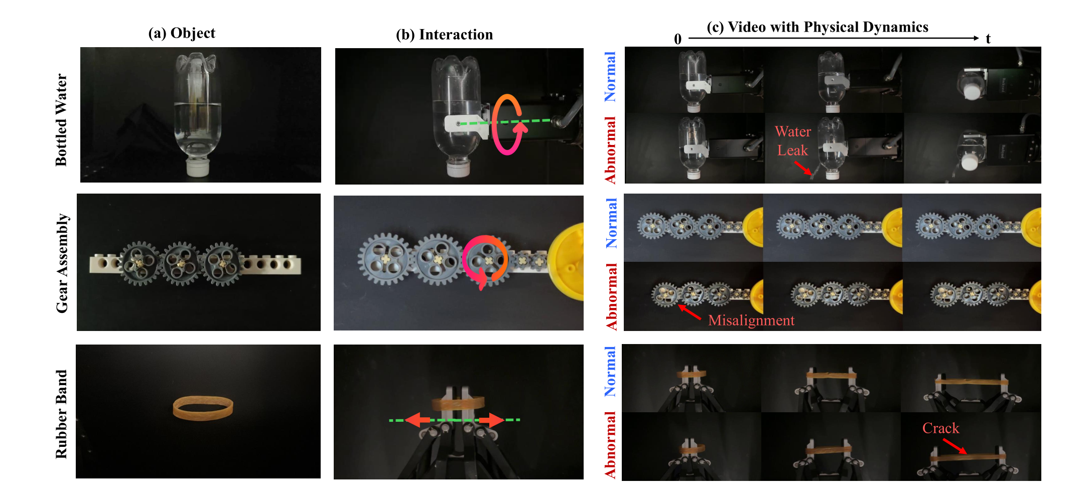 针对工业异常检测算法大多依赖于静态、语义简单的数据集,难以识别产品功能异常的问题,课题组提出了首个大规模、交互驱动的工业异常检测视频数据集Phys-AD(Physics Anomaly Detection),旨在提升算法基于物理先验知识来理解、推理和判断功能异常的能力。通过机械臂、电机等与产品进行交互,设计并采集了6400个视频;针对22种产品类别,设计了机械故障、运动异常等47种功能异常的场景。Phys-AD的任务更强调视觉推理,要求算法结合物理先验知识与视频内容,判断产品是否存在功能异常。在进行基准测试的同时,本研究还引入 PAEval 评测指标,衡量算法在检测异常的同时解释其物理原因的能力,推动异常检测算法向更具物理推理能力的方向发展。该成果以“Towards Visual Discrimination and Reasoning of Real-World Physical Dynamics: Physics-Grounded Anomaly Detection”为题,被CVPR 2025会议接收。