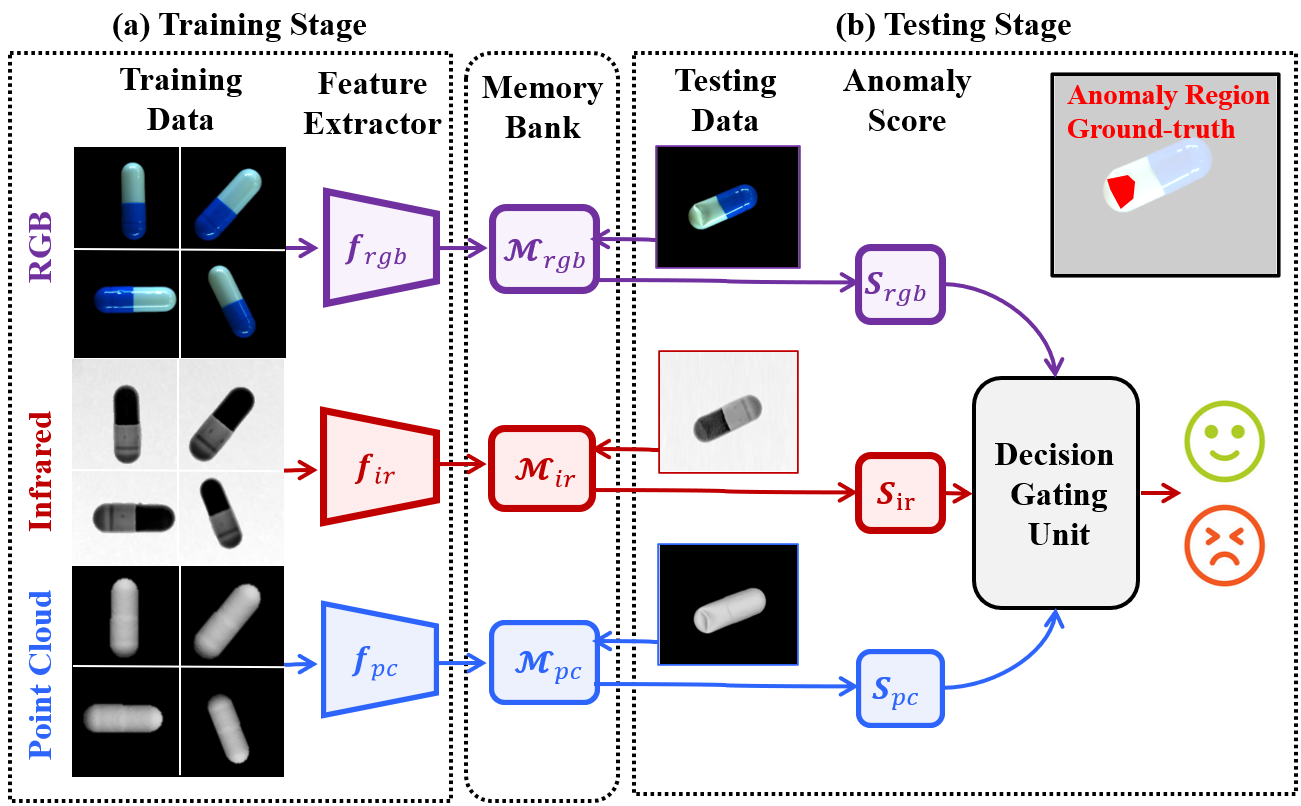 针对单一传感器在同时捕捉产品外观、尺寸、内部属性等信息时存在显著局限性的问题,课题组提出了基于多传感器融合的工业异常检测方法。为了获得产品的全面信息,建立了首个面向工业应用的高分辨率、多模态异常检测数据集MulSen-AD(Multi-Sensor Anomaly Detection)。针对15种产品类别,设计了孔洞、折痕、异物、划伤、折弯、内部裂纹等14种真实缺陷,共计2035个样本;通过RGB图像、三维点云、红外图像三种形式的数据分别呈现产品的外观缺陷、几何变形以及内部浅表损伤等异常。本研究还提出了融合多传感器数据的决策级融合算法MulSen-TripleAD,结合 RGB 纹理、红外热信号和 3D 点云信息,在无监督异常检测任务中取得了当前最好的性能,为现有复杂工业异常检测任务提供了新的研究思路。该成果以 “Multi-Sensor Object Anomaly Detection: Unifying Appearance, Geometry, and Internal Properties” 为题,被 CVPR 2025会议接收。