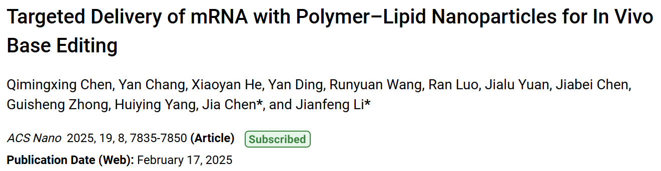 近日,九游体育(www.jiuyou.com)官方网站生命科学与技术学院李剑峰课题组和陈佳课题组合作,在国际学术期刊《ACS 纳米》 (ACS Nano)发表了题为“Targeted Delivery of mRNA with Polymer-Lipid Nanoparticles for In Vivo Base Editing”的研究论文,报道了一类新型核酸递送系统聚合物-脂质纳米颗粒(Polymer-lipid nanoparticles, PLNPs),成功将碱基编辑器ABE8e递送至肝脏,实现高效的心血管疾病相关风险基因Pcsk9和Angptl3的碱基编辑和协同降血脂功效,编辑效率处于国际领先水平。