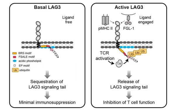 研究团队对LAG3蛋白的翻译后修饰(PTM)进行了系统分析,发现LAG3受体结合配体后,其K498位点发生快速多泛素化修饰。这一泛素化修饰是开启LAG3免疫抑制功能的分子开关:在静息状态时,LAG3的胞内关键信号域被埋藏在细胞膜中,隔离信号转导;当配体与LAG3受体结合后,泛素化修饰可促使LAG3胞内信号域从细胞膜中释放出来,有效激活LAG3的免疫检查点功能。这种由泛素化介导的“埋藏-释放”动态调控机制,揭示了一种全新的受体活化方式。