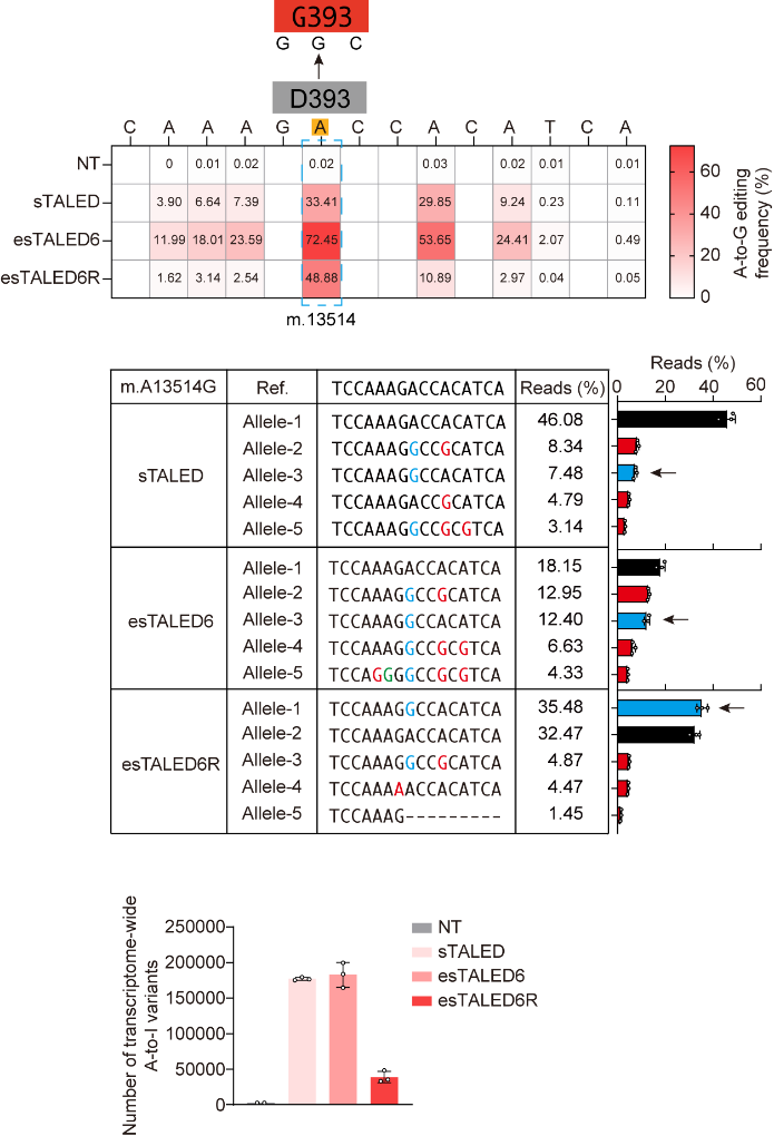 图2:sTALED、esTALED6和esTALED6R和在线粒体基因组m.13514位点处介导的编辑效率(上),编辑产物纯度(中)以及转录组脱靶数量(下)
