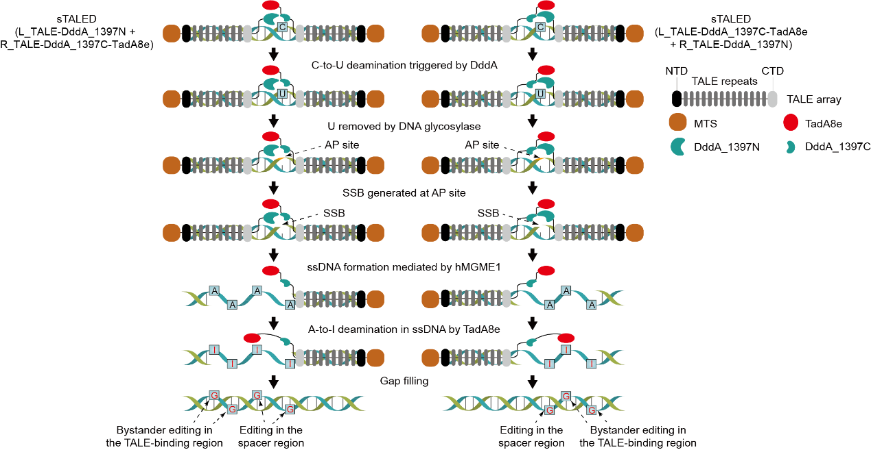本研究构建了多个BER相关基因的敲除细胞株,结合体外脱氨实验发现TALEDs并非直接在双链DNA上进行A-to-G编辑,而是依赖DddA诱导C-to-U的脱氨反应,触发线粒体碱基切除修复(BER)过程。TALED中的DddA首先介导了C-to-U的脱氨,体内的尿嘧啶糖苷酶会进一步切除所产生的尿嘧啶(U),形成碱基缺乏(AP)位点,含有AP位点的DNA单链被APE1催化切割或自发断裂,产生DNA单链断裂(SSB)。SSB被核酸外切酶hMGME1进一步加工形成单链DNA(ssDNA),TALED中的TadA8e以ssDNA为底物介导A-to-I的脱氨反应,并在随后的修复过程中完成A-to-G的编辑(图1)。