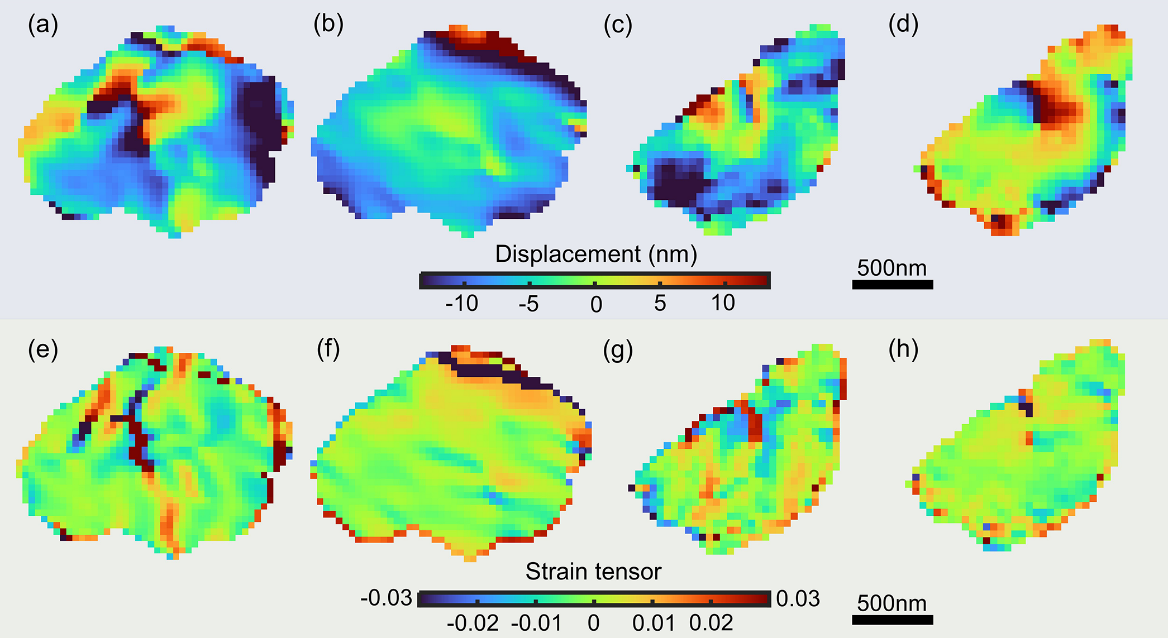 图2单脉冲衍射斑经过相位恢复后,得到的两个晶体的原子位移图(a-d)和应变张量图(e-h)