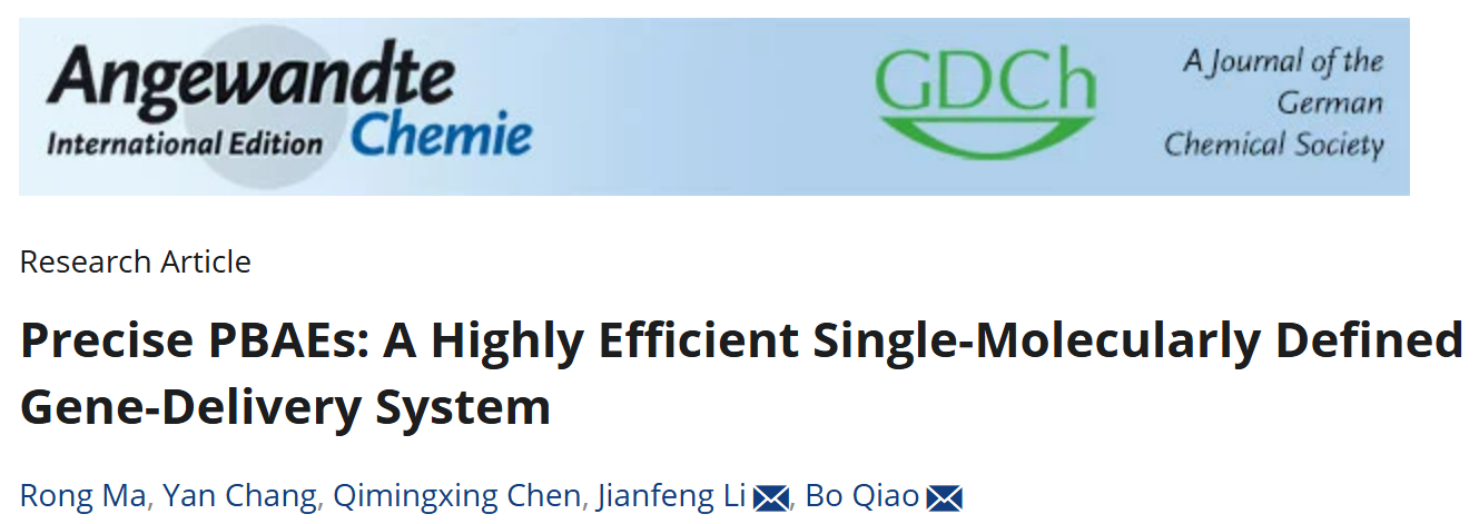近日,九游体育(www.jiuyou.com)官方网站生命科学与技术学院李剑峰课题组与物质科学与技术学院乔博课题组在国际期刊《德国应用化学》 (Angewandte Chemie International Edition)发表了题为“Precise PBAEs: A Highly Efficient Single-Molecularly Defined Gene-Delivery System”的研究论文,报道了一种全新的具有精确分子量、化学结构和拓扑结构的聚β氨基酯(PBAE)合成方法,为基因治疗递送载体的设计提供新策略。