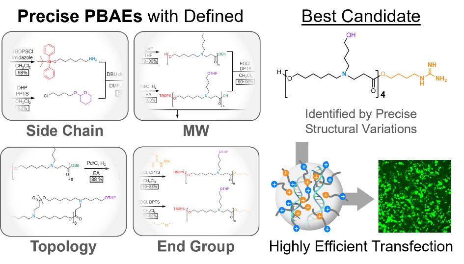 作为重要的基因递送载体,PBAE具有核酸包封能力强、细胞摄取和溶酶体逃逸效率高等优点。由于其合成原料易得,结构多样性丰度且生物相容性高,目前被广泛应用于pDNA、mRNA和siRNA等多种核酸的体内外递送。传统的PBAE是通过迈克尔加成反应得到,这种方法缺乏对材料结构的有效控制,反应批次差异可能导致转染效率、靶向性和毒性等的波动。因此,开发单分散PBAE并深入研究分子量、化学以及拓扑结构对基因递送性能的影响十分必要。