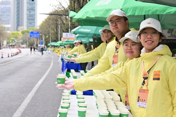从赛前选手引导到解说,从分装16000包赛事装备到为8000名选手精准发放物资,志愿者们用细致服务筑牢赛事基础。比赛当天,志愿者化身赛道补给站的“小马达”,在9km和11km的点位为选手提供饮用水,加油助威,用实际行动为运动员们提供最坚实可靠的后勤保障。