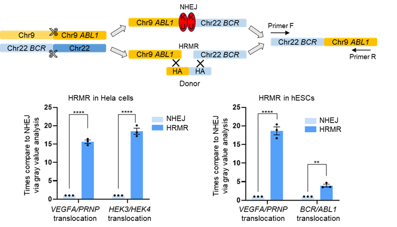 本研究中,HRMR显著提高了染色体重排的编辑效率,例如在模拟慢性粒细胞白血病(CML)相关的费城染色体易位(BCR/ABL1)时,其效率比传统方法高出20倍。同时,HRMR在多种细胞类型(如HEK293T、Hela细胞、人类胚胎干细胞)以及多个基因位点上均表现出卓越的编辑效率,适用于随机和疾病相关的染色体重排。此外,研究团队通过优化供体模板设计、引入核定位信号以及抑制NHEJ关键蛋白,进一步提升了HRMR的效率和精准度。HRMR不仅适用于癌症等疾病的建模,还为染色体水平的基因治疗提供了新思路,特别是在纠正费城染色体等致病性染色体异常方面,展现了潜在的临床应用价值。