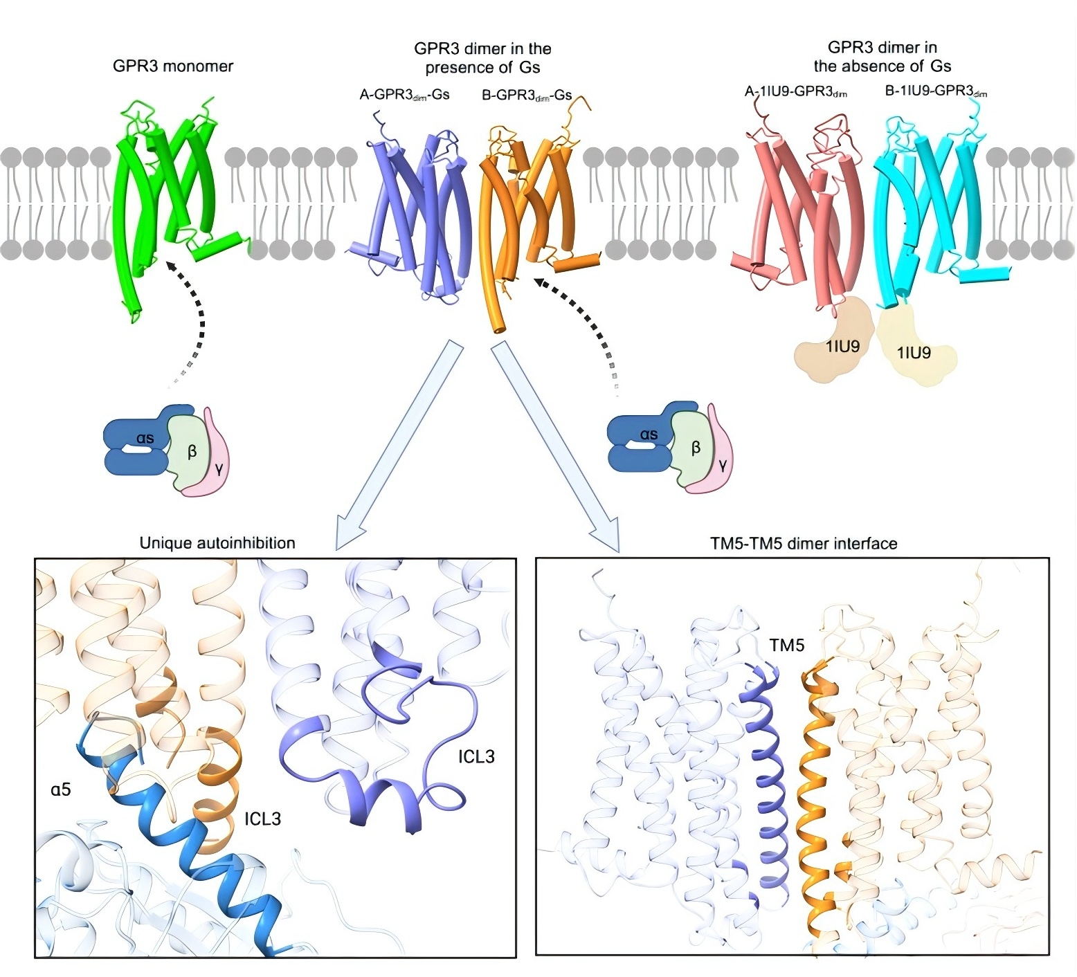 图1. GPR3的二聚化和自抑制分子机制展示图
