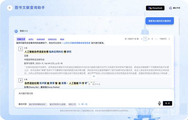 智能小Q系统无缝对接学校纸质图书资源和订购的电子文献资源,借助AI的强大能力,提升资源的可发现性,助力师生更好地使用图书馆资源。同时,它还接入了PubMed、arXiv、DOAJ等预印本开源平台,让用户第一时间掌握科研前沿动态。