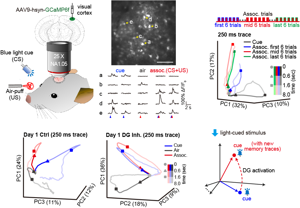 图注:受到关联性刺激后,视皮层中迅速出现表征记忆特性的神经元集群;这种皮层神经元集群的出现受到海马体-齿状回活性的调控